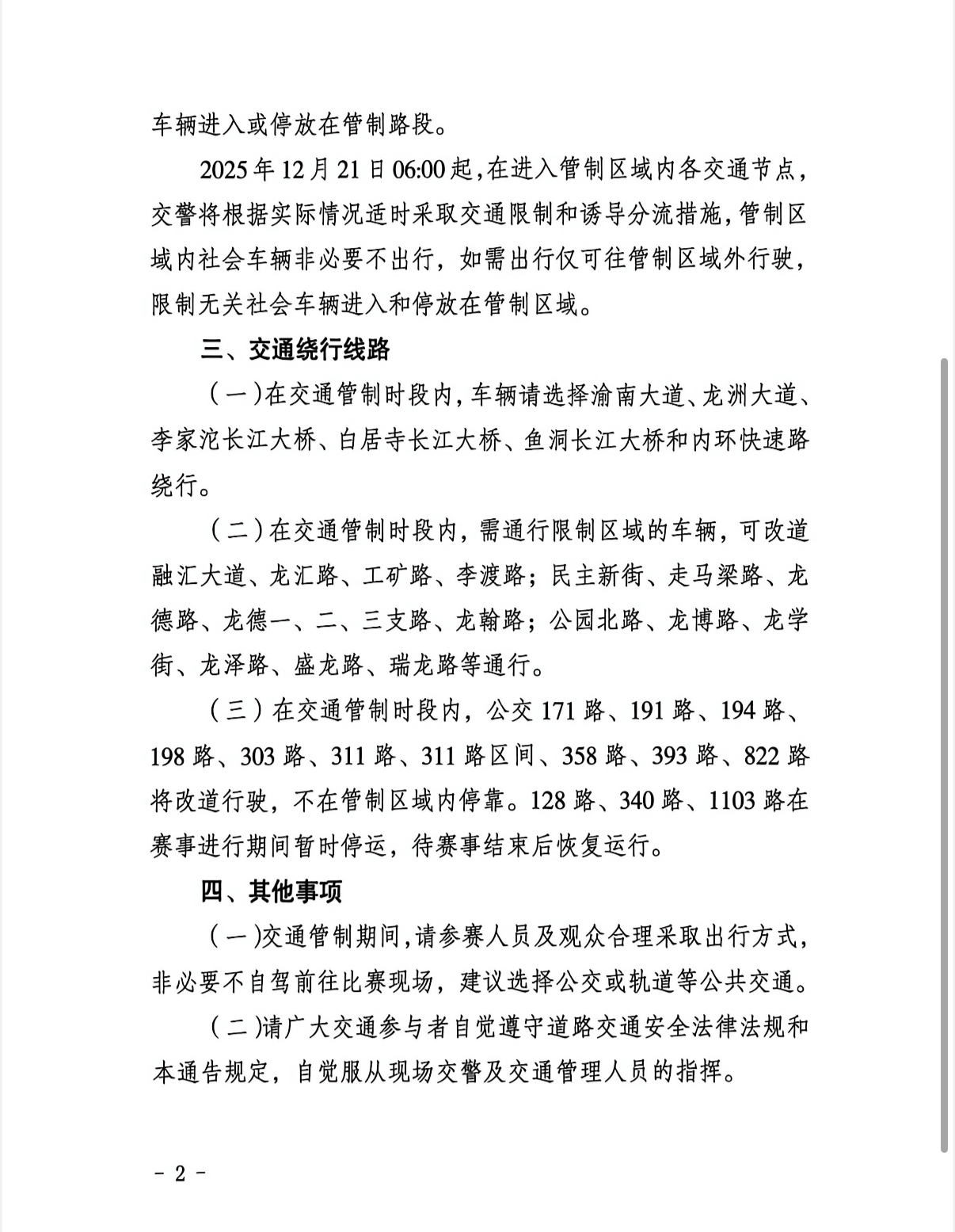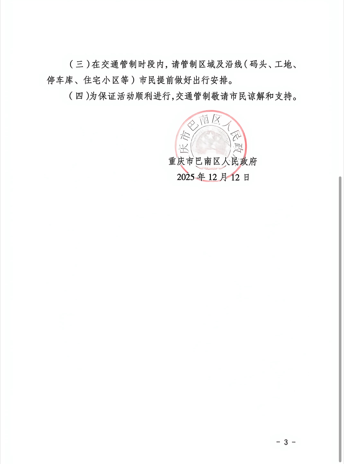 3. 详细信息:本次交通管制的具体路段、区域划分等,详见下图《重庆市巴南区人民政府关于2025年重庆半程马拉松期间对巴南区部分路段实施交通管制的通告》。请各位居民提前规划出行路线,尽量选择公共交通等绿色出行方式,预留充足出行时间。交通管制期间,请自觉遵守相关规定,服从现场工作人员指挥。