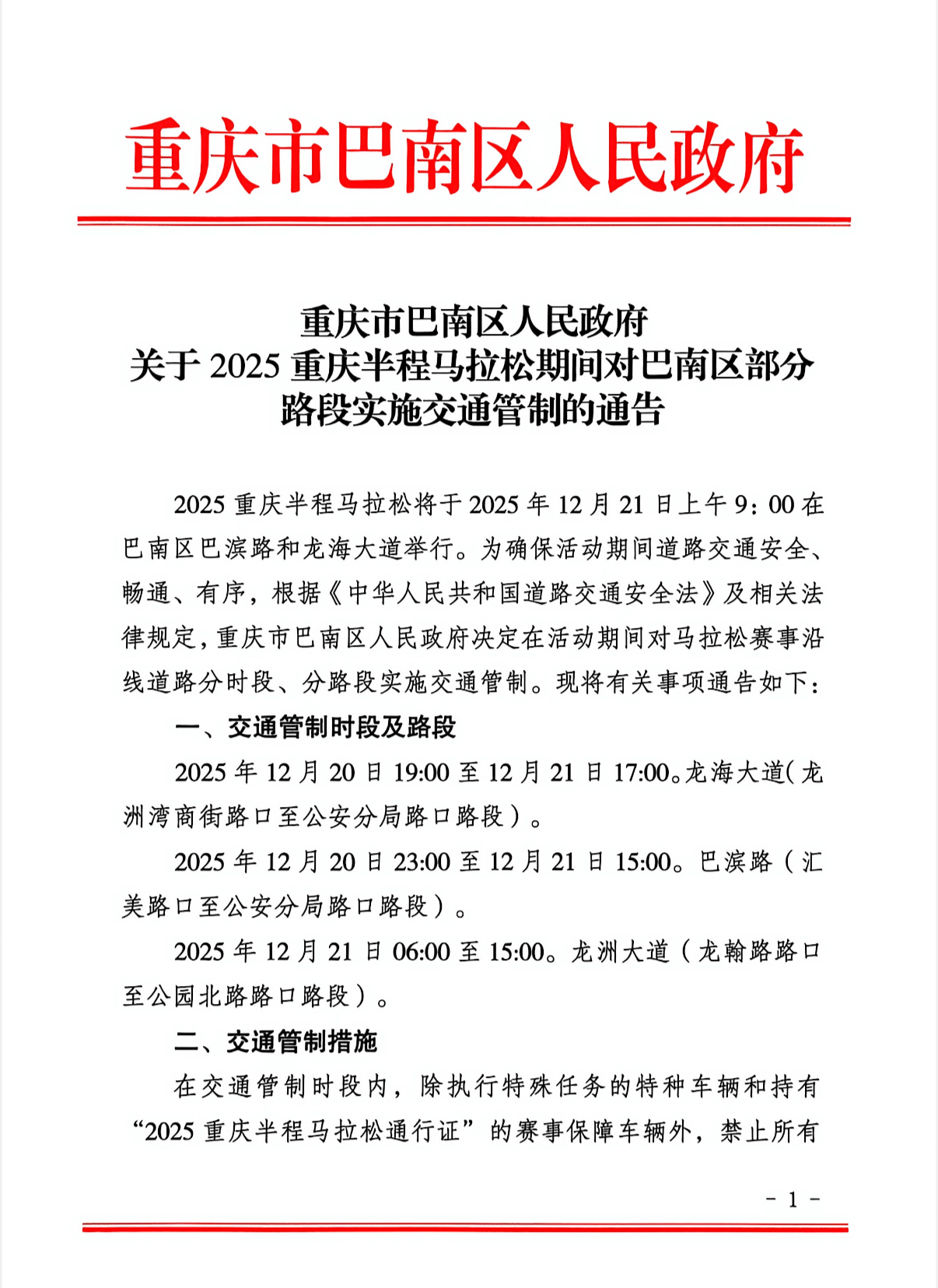 3. 详细信息:本次交通管制的具体路段、区域划分等,详见下图《重庆市巴南区人民政府关于2025年重庆半程马拉松期间对巴南区部分路段实施交通管制的通告》。请各位居民提前规划出行路线,尽量选择公共交通等绿色出行方式,预留充足出行时间。交通管制期间,请自觉遵守相关规定,服从现场工作人员指挥。